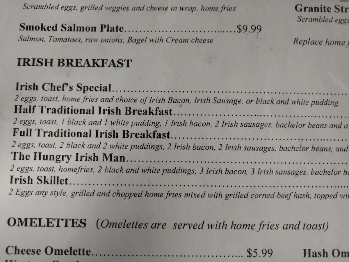 3 eggs, cheese, Irish bacon, irish sausage, black & white pudding. home fries, toast