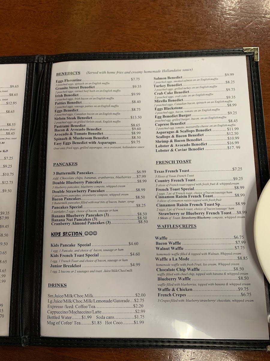 1 egg, 1 french toast and choice of bacon, sausage or ham.